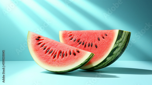 A vibrant watermelon with a slice, set against a soft turquoise background, creating a fresh and appetizing visual appeal.