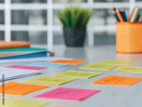 A vibrant workspace featuring colorful sticky notes, a potted plant, and stationery, ideal for creative brainstorming and planning.