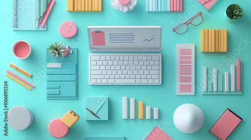 A vibrant workspace layout featuring a laptop, charts, stationery, and decorative items in pastel colors against a turquoise background.