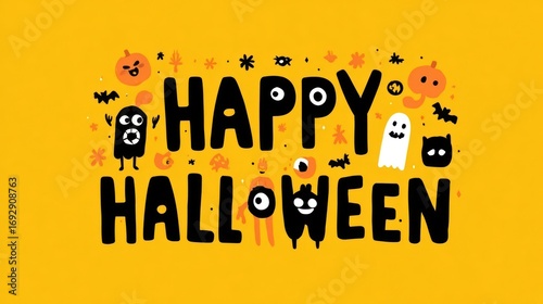 A vibrant yellow background features a playful "Happy Halloween" message in bold black lettering, surrounded by various cute cartoon monsters, pumpkins, and Halloween-themed elements