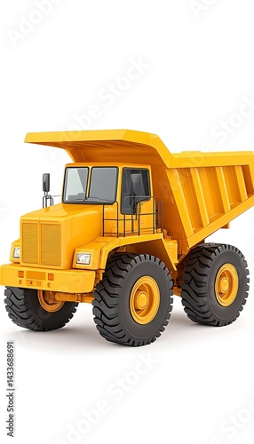A vibrant yellow dump truck, robust and ready for heavy-duty hauling, sits against a stark white background