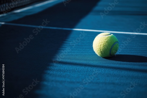 A vibrant yellow tennis ball rests on a dark blue court surface, casting soft shadows. This image captures the essence of sport and leisure, highlighting focus and precision in athletic activities.