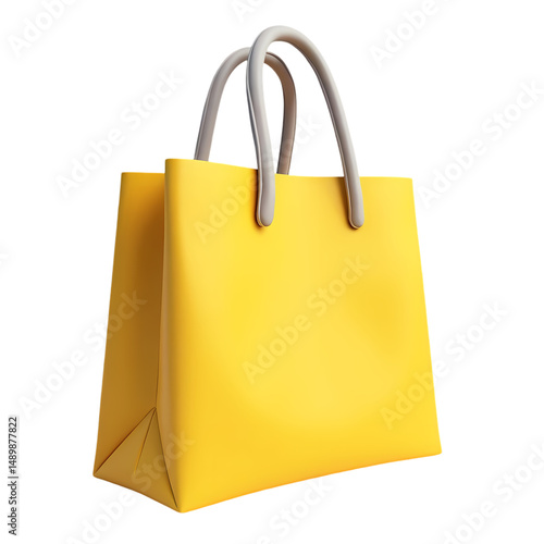 A vibrant yellow tote bag with gray handles isolated against a stark in a studio shot isolated on transparent backgruond