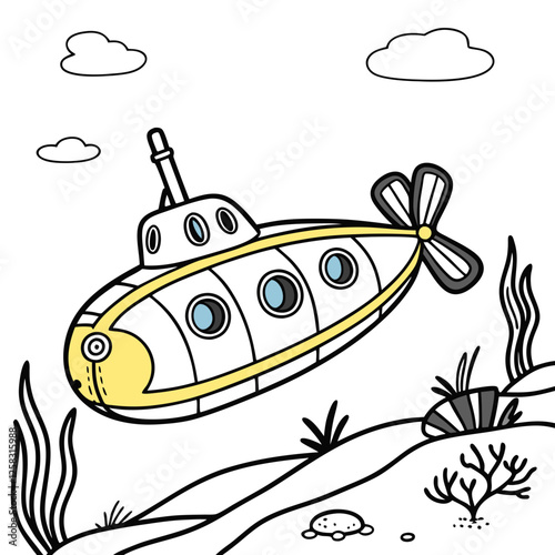 A vibrant yellow toy submarine with a spinning propeller, detailed close-up shot, bright background.