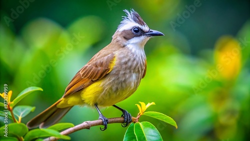 A vibrant yellow-vented bulbul perches on a lush green branch, its bright plumage and distinctive crest capturing