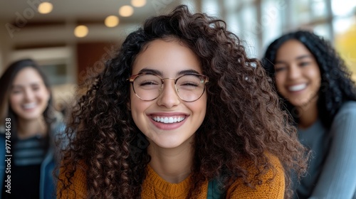 A vibrant young woman with curly hair and glasses smiles brightly in a softly lit indoor setting, exuding confidence, warmth, and youthful energy with friends.