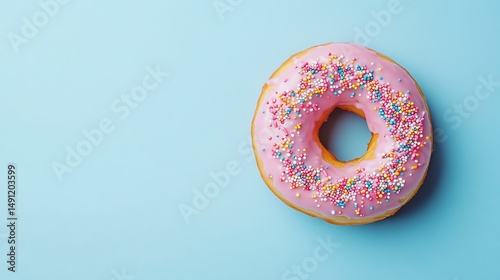 A vibrantly colored donut covered in sprinkles is displayed on a pastel blue background.