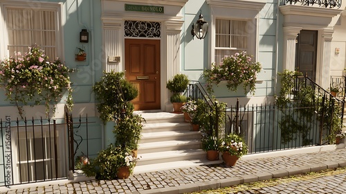 A Victorian terrace house with a decorative iron balcony, wooden front door, potted plants, and cobblestone street