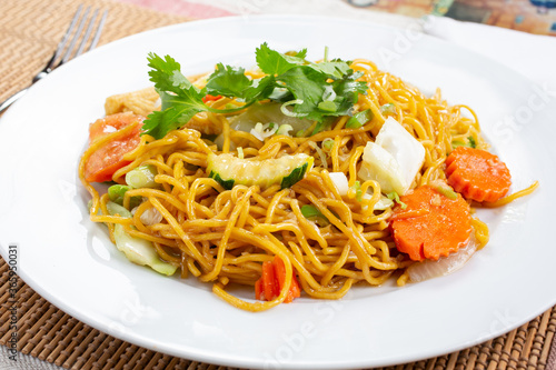 A view of a plate of chow mein, in a restaurant or kitchen setting.
