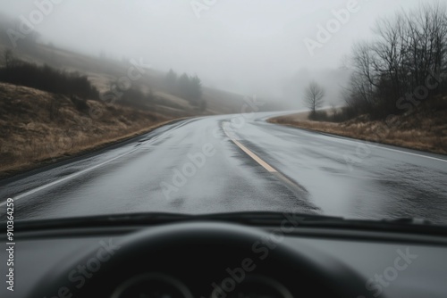 A view of a wet road from inside a car, with a misty landscape ahead.