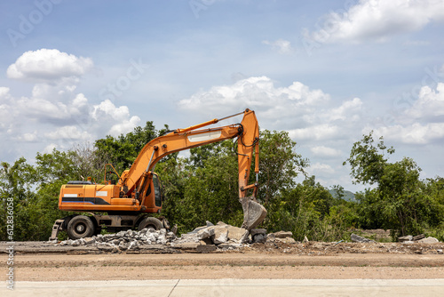 A view of a yellow backhoe parked on the pavement of a demolished concrete road.