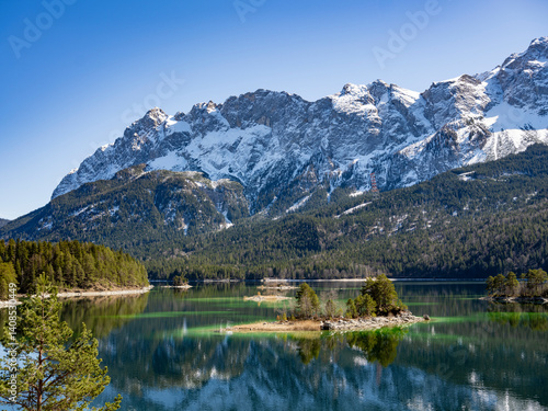 A view of Lake Ebsee in Germany with its emerald green water and a tiny island in the middle. Forested and partly snow-capped mountains rise in the distance.