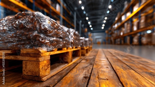 A view of stacked wooden pallets in a spacious warehouse, emphasizing the industrial aspect and organized storage in a vibrant environment.