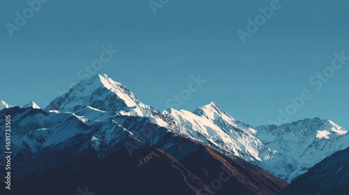 A view of the peaks, Snow-capped mountains, with blue sky in the background, No clouds, rising from left to right, minimalism
