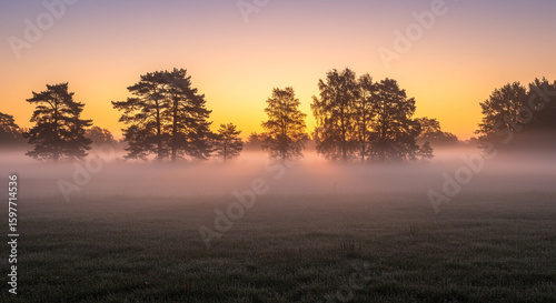 A view of trees silhouetted against a hazy sky with fog covering the ground at sunrise