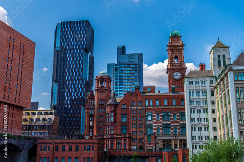 A view over the River Medlock towards buildings with contrasting architecture styles in Manchester,UK in summertime