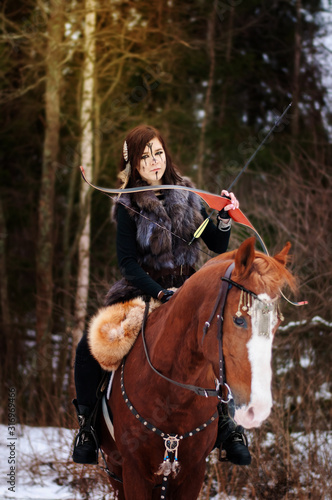 a Viking girl riding a red horse painted in black runes. holds a bow and shoots it