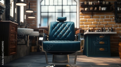 A vintage barber chair sits in an inviting barbershop featuring exposed brick walls and classic wooden furniture. The space is well-lit, creating a warm atmosphere
