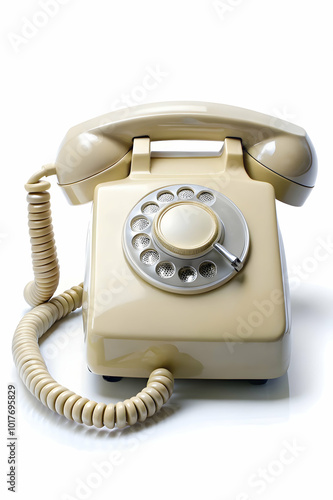 A vintage beige rotary phone sits isolated on a white background.