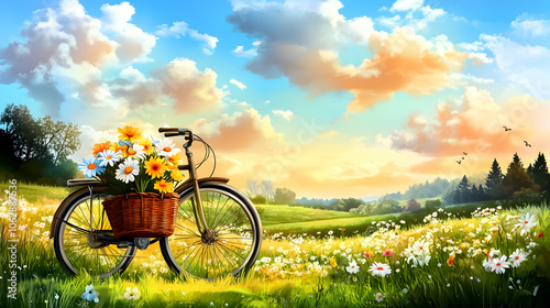 A vintage bicycle with a basket full of flowers sits in a field of wildflowers against a backdrop of a blue sky and clouds.