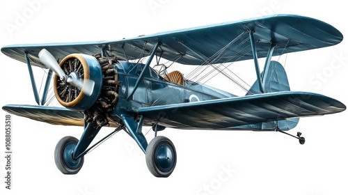 A vintage biplane with an open cockpit, ready for flight, isolated on a white background