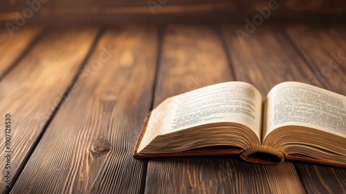 A vintage book with leather binding lying open on a wooden table, its pages filled with rich text and historical knowledge.