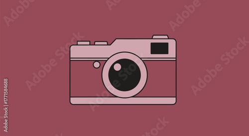 A vintage camera illustration, shades of pink and burgundy. Simple design, outlined