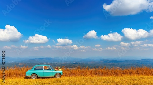 A Vintage Car on a Scenic Road Trip Through Autumnal Countryside