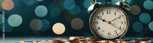A vintage clock with a focus on time and value, surrounded by golden coins and a blurred colorful background.