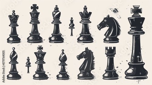 A vintage collection of monochrome chess pieces featuring detailed and intricate designs, ideal for history enthusiasts or those who appreciate traditional chess artistry.