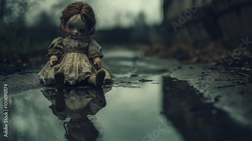 A vintage doll with a sad expression sitting in a puddle, reflecting the gloomy surroundings.