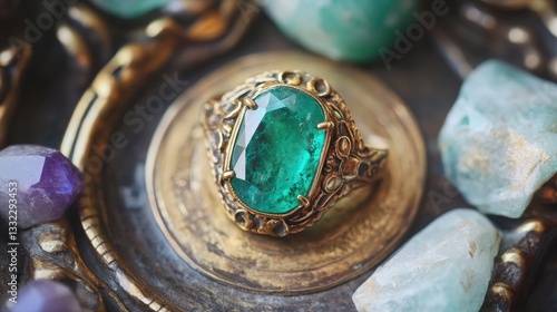 A vintage emerald gemstone ring with an intricate gold setting, placed on a decorative tray.