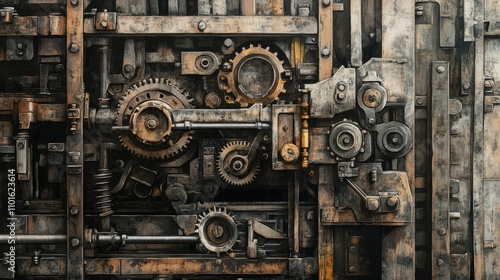 A vintage illustration of a heavy-duty stamping press, with intricate gears and mechanical details, creating an industrial atmosphere