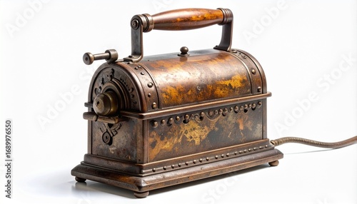 A vintage iron on a plain white background, photographed from a tilted cinematic perspective.