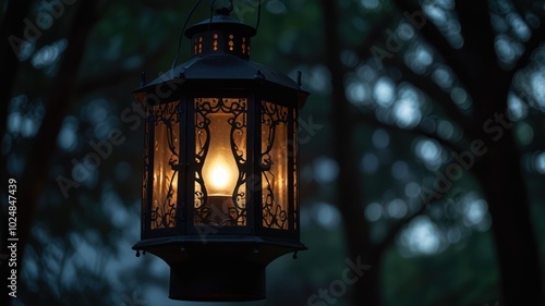 A vintage lantern hangs from a tree branch, casting a warm glow against a backdrop of blurred greenery. The lantern is made of black metal with intricate details