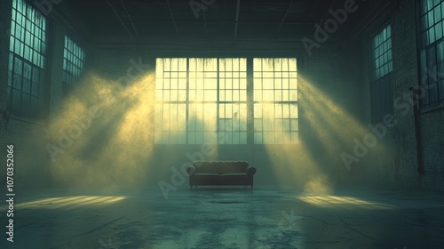 A vintage leather sofa sits alone in a large, dusty warehouse space illuminated by the golden rays of morning sun streaming through large windows.