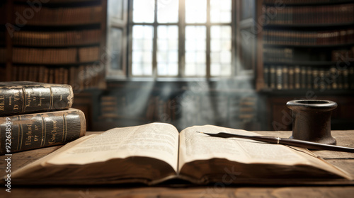 A vintage library with an open book, quill, and inkpot, filled with warm light and rich historical atmosphere.