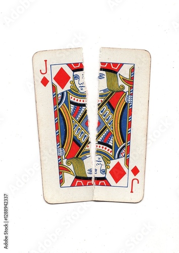 A vintage playing card torn in half from top to bottom on a white background.