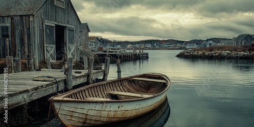 A vintage row boat docked by a rustic pier, evoking a sense of nostalgia and serenity.