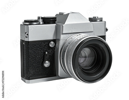 A vintage silver and black 35mm SLR camera with a large lens, showcasing classic design elements
