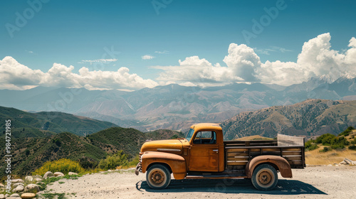 A vintage truck with custom wooden side panels, parked on a scenic overlook with mountains in the background, capturing the spirit of classic road trips