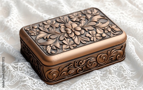 A vintage Victorian-style jewelry box made of bronze, adorned with intricate floral carvings