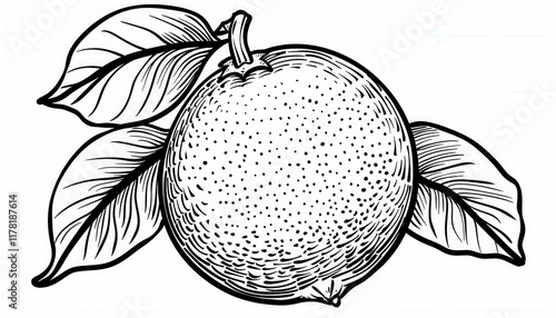 A vintage woodcut illustration of a lemon with leaves. Ideal for food packaging, menus, or labels to evoke a natural, classic aesthetic.