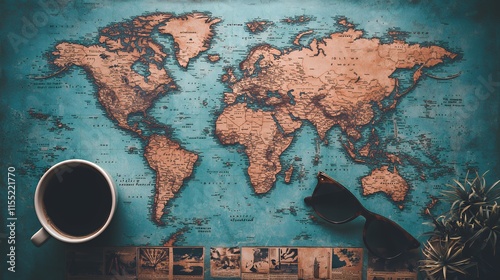 A Vintage World Map with Coffee, Sunglasses, and Succulent: Embark on Your Global Adventure!