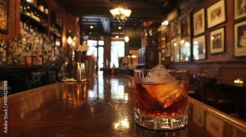 A vintage-style Old Fashioned with a large ice cube, perfectly clear with a touch of bitters, placed on a mahogany bar