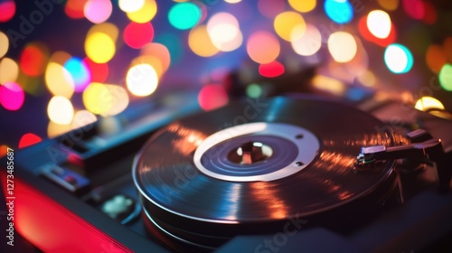 A vintage-style turntable with a vinyl record on top, ready for playback