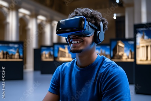 A virtual classroom with students using VR headsets, exploring historical landmarks and learning through immersive experiences