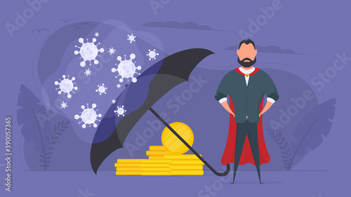 A virus-protected businessman is hidden under an umbrella. Virus attack on business. Vector illustration