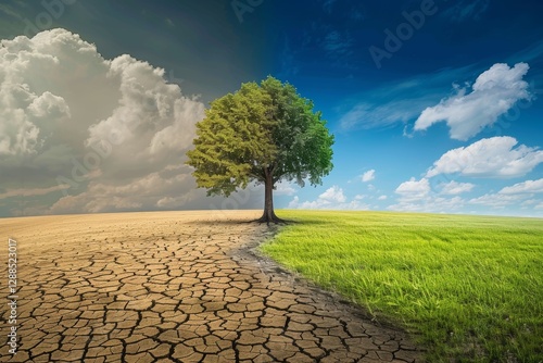 A visual contrast of climate change half dry tree and lush green grass in split screen photography