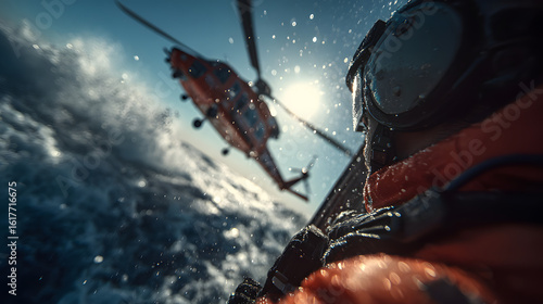 A visual of a rescue operation in progress featuring a helicopter hovering above the ocean while a crew member holds up an activated EPIRB sending a distress signal with visible waves